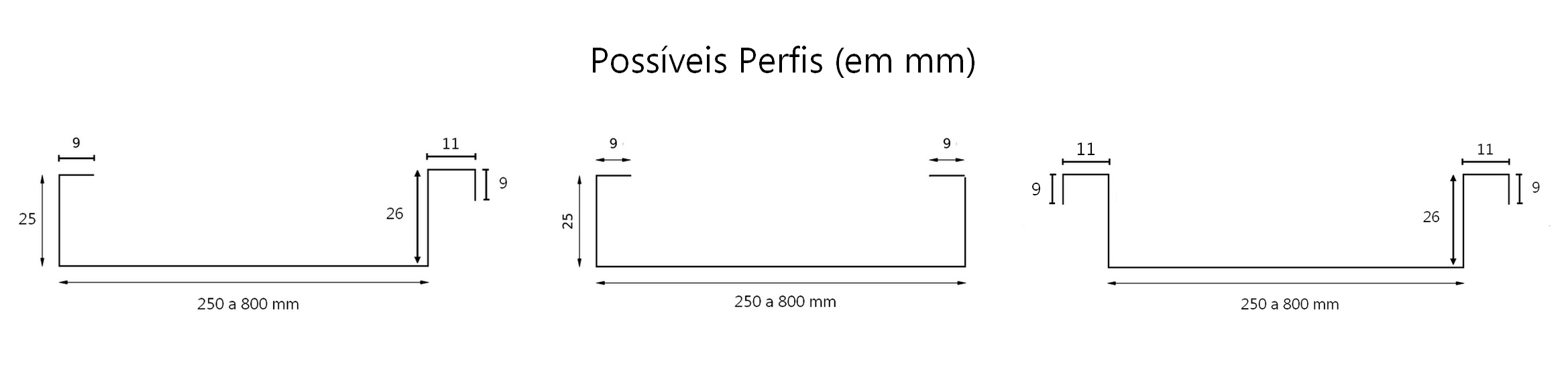 Largura da base do perfil: 250 a 800 mm.